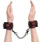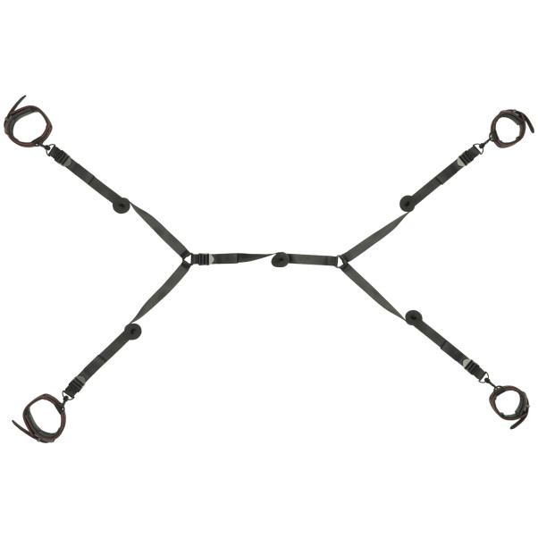 Take your restraint adventure to stunning heights with the four padded faux leather cuffs in a reversible design, one side black and the other rosy metal. Each cuff features a D-ring from which they can be connected to the straps of this set, or, with the use of the included chain, can be used alone for simpler restraint play.