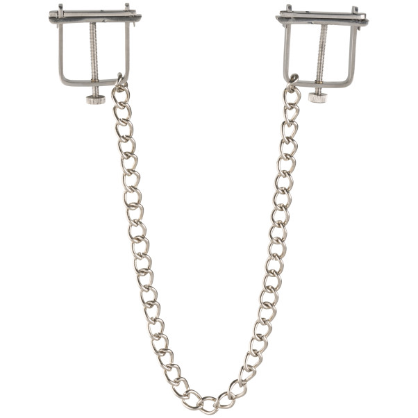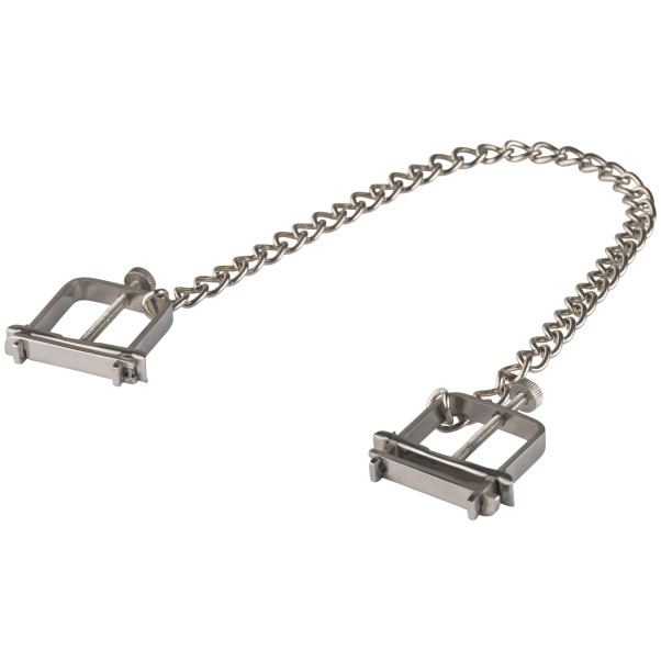 The solid steel clamps are connected with a chain that, when pulled, provides an added tug and pull sensation to your sensitive nipples.