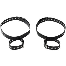 Strap in for sexy fun with the Thigh to cuff restraint set from obaie. Smooth faux leather and metal buckles hug your thighs while keeping your hands tied.