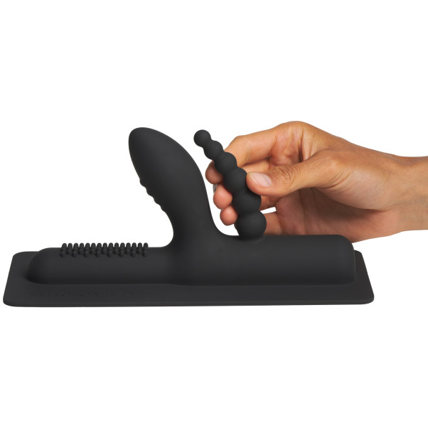 Slide yourself down on the anal beads that grow in size as you make your way down the chain. Then a thick-shafted dildo with stimulating ribs massages your G-spot while tons of stimulating nubs tease your clitoris as you rock back and forth.