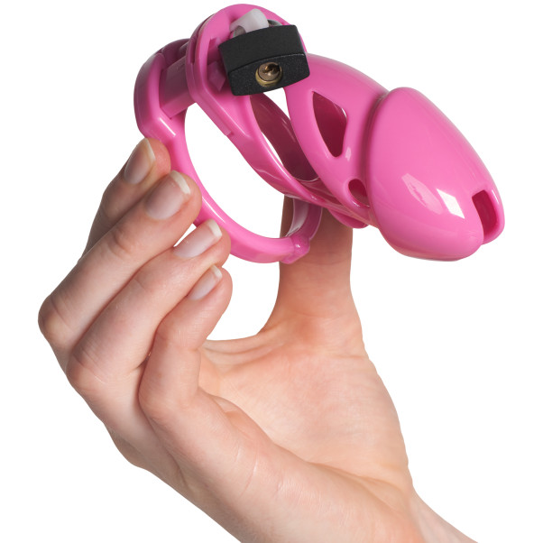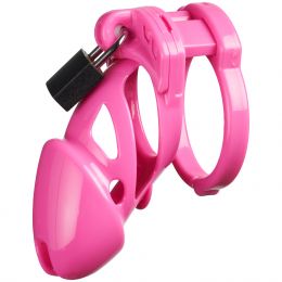 The pretty pink chastity device consists of a cock cage (choose from 3 sizes), 4 base rings in different sizes, 4 spacers and locking pins, 3 anti-pullouts with textured sides, 1 locking pin cap and a padlock with 2 keys. It can also be assembled without an anti-pullout to make it more beginner-friendly, and the anti-pullout can be attached later on to make the cage even more secure.